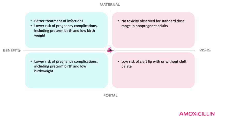 For the mother, adjusting treatment doses of amoxicillin in pregnancy to match non-pregnant regimens is expected to counteract pregnancy-related reduction of amoxicillin exposure. Thereby reducing the risk of subtherapeutic exposure and treatment failure. At these doses, maternal toxicity appears limited, while untreated or undertreated infection in pregnancy carries substantial complications.