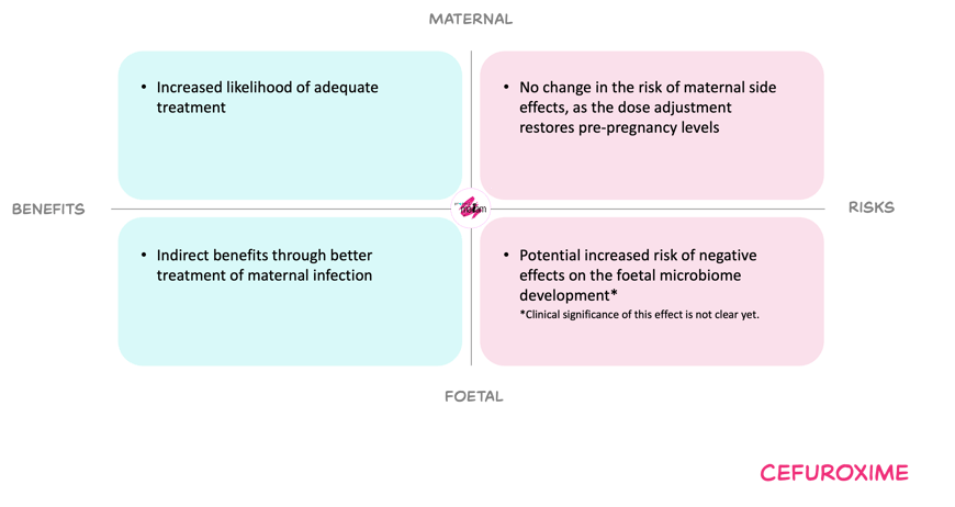 For the foetus, undertreated maternal infection is associated with adverse outcomes including preterm birth and low birth weight, so optimising maternal treatment is expected to be beneficial. Cefuroxime does cross the placenta and exposes the foetus, but observational data with cefuroxime and other cephalosporins do not indicate an increased risk of congenital abnormalities. Foetal antibiotic exposure may alter the development of the foetal microbiome, but the clinical impact and any dose–response are unclear. Therefore, the foetal risk from the proposed higher dosing frequency is judged very low.