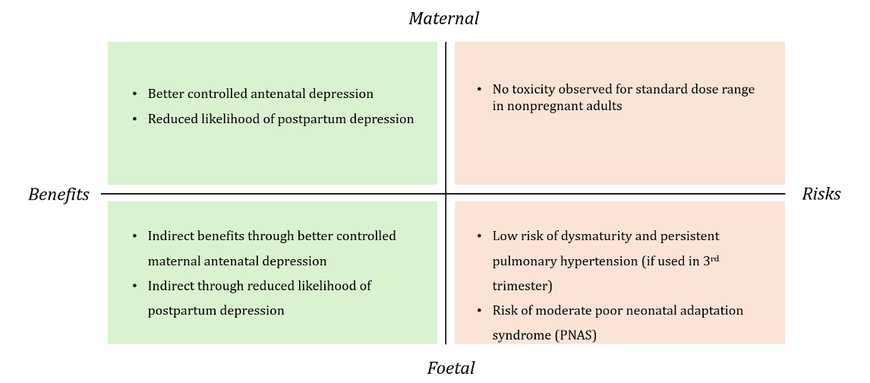 The expected benefits and associated risk of a higher dosing regimen of citalopram during pregnancy.