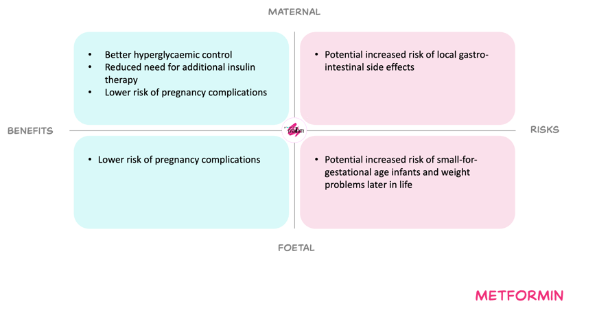 For the mother, increasing the dose to compensate for the fall in exposure in third trimester, may improve glycaemic control. Better control may reduce risks such as pre-eclampsia, stillbirth and other diabetes-related complications, and may reduce or delay the need for additional insulin when this is contra-indicated or not preferred. Gastro-intestinal adverse effects remain dose-limiting but are usually transient and manageable with gradual titration. Overall, no new maternal toxicity signals have been identified within the dose range already used in nonpregnant adults.